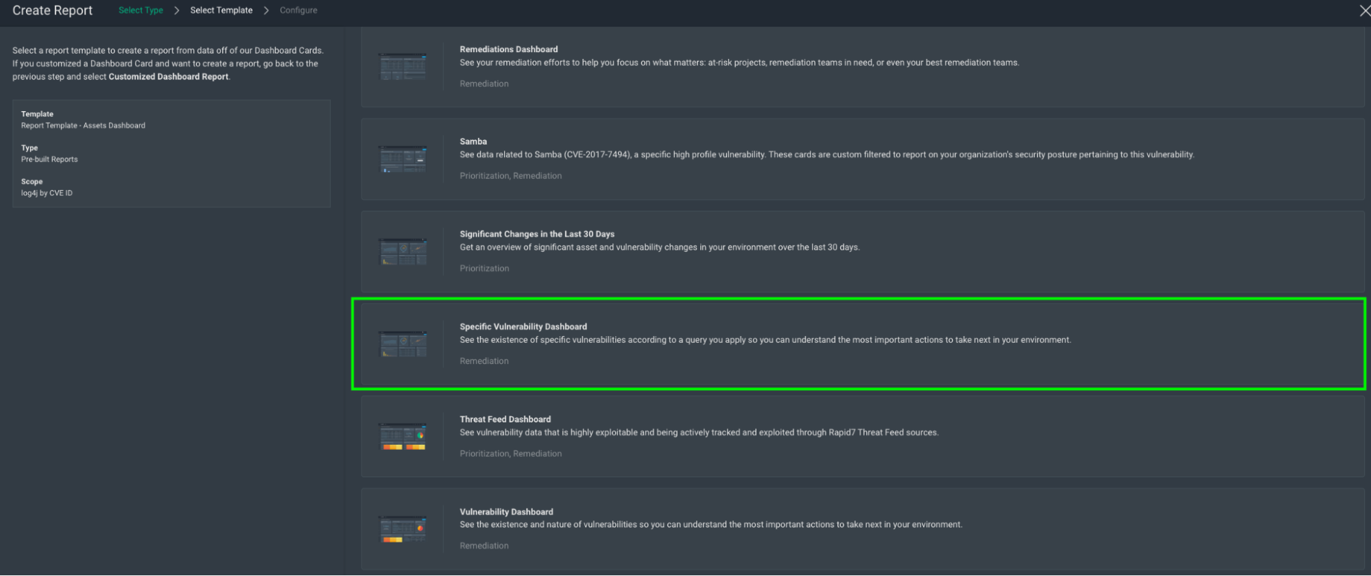 InsightVM users may also create a report that’s based on the Specific Vulnerability dashboard template and have this generated on a recurring basis (N number of days, weeks or months). Follow these steps in order to create this report.