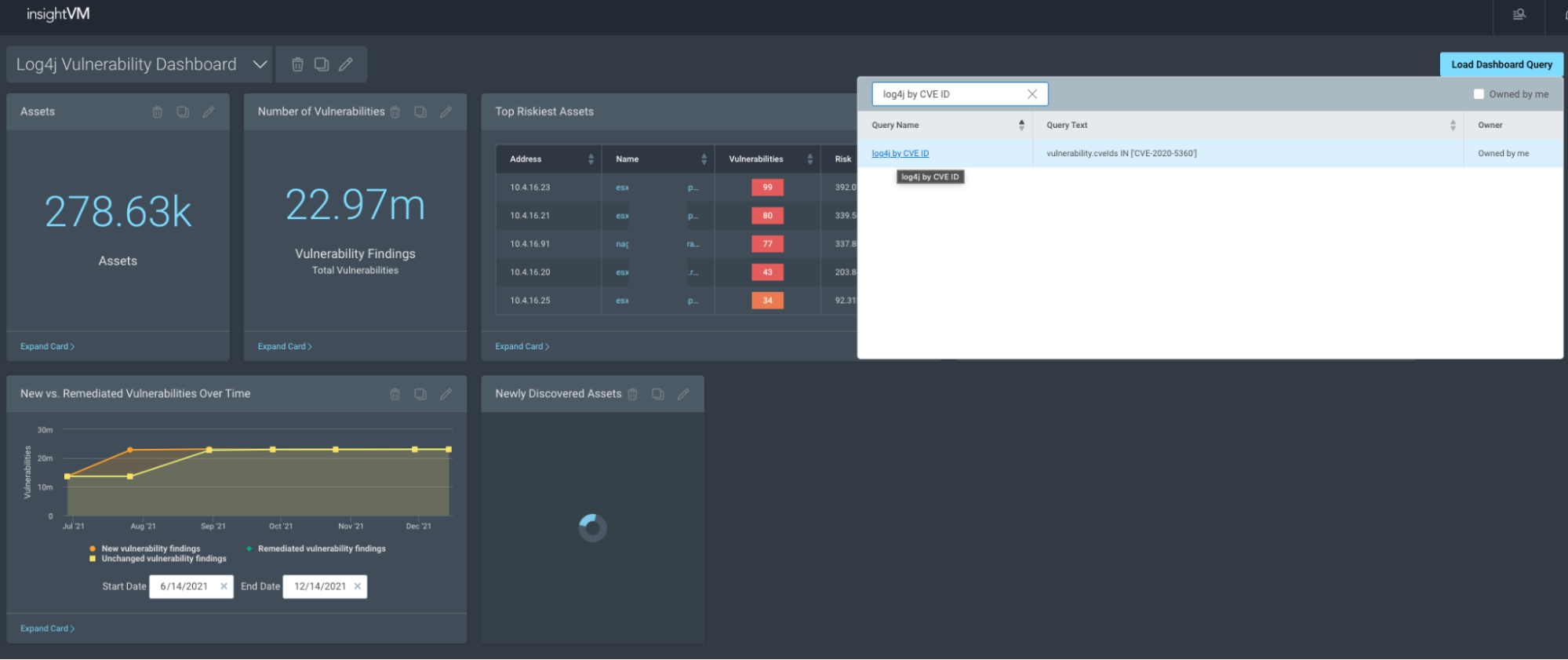 Rapid7 released the Specific Vulnerability Dashboard template and the “Log4j by CVE ID” helpful query in the Query Builder on Tuesday, December 13, 2021. Our intent is to allow customers to quickly and easily report on the Log4j vulnerability. More importantly, this gives us a dashboard template that we can leverage in the event of other urgent vulnerability notices.