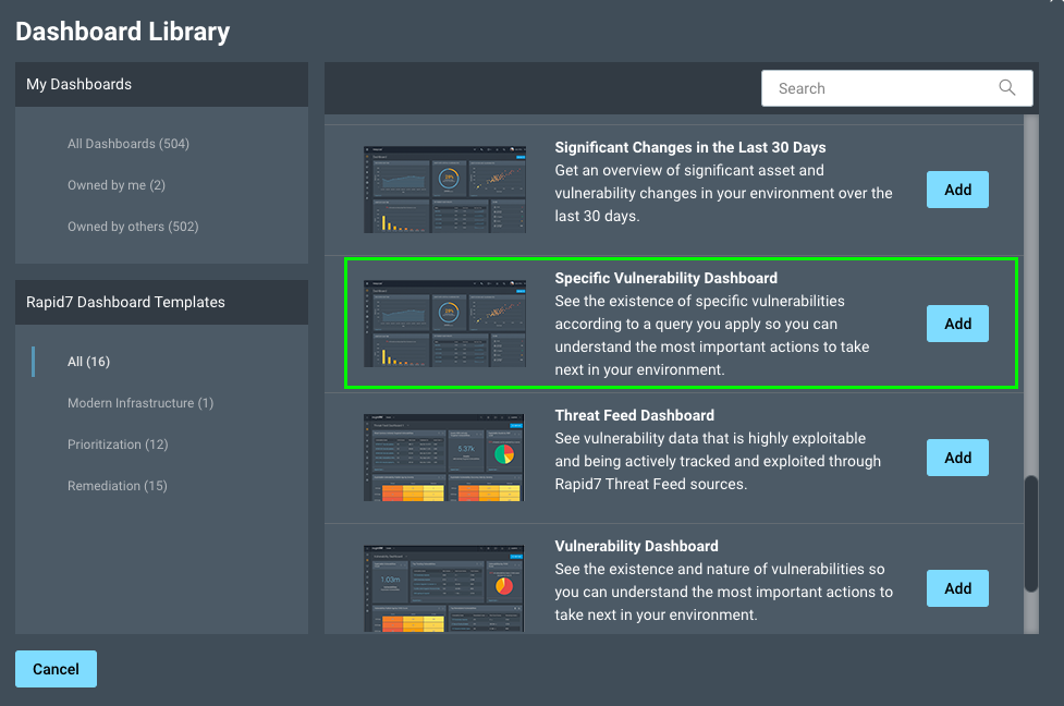 - From the list that appears, select Specific Vulnerability Dashboard.