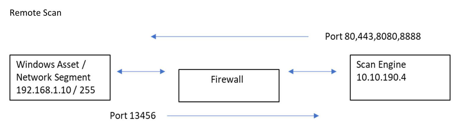 Source 10.10.190.4 Service 80/443/8080/8888 Destination 192.168.1.255 - If you are not seeing any response back or seeing that you are finding ZERO vulnerabilities it is very possible that the issue is with the firewall rule (or network configuration). Check your firewall logs for any drops from the Windows Asset on Port 13456 attempting to talk to your Scan Engine. Also make sure that your Scan Engine is allowed to make the request to your Network Segments on ports 80,443,8080,8888 to initialize the trap/attack.