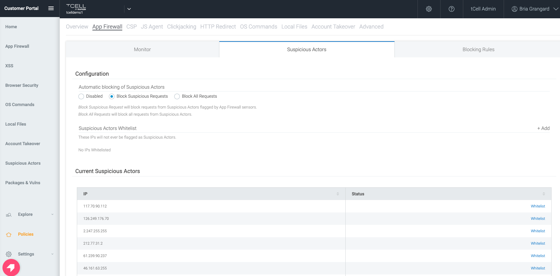 Not only can you monitor for suspicious actors with tCell, but you can also configure tCell to block all activity or just the suspicious activity from the malicious actor’s IP.