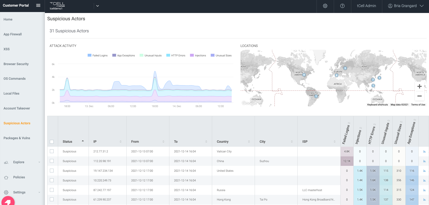 All events that are detected by the App Firewall in tCell are fed into the analytics engine to determine Suspicious Actors. The Suspicious Actors feature takes in multiple inputs (such as failed logins, injections, unusual inputs, etc.) and correlates these to an IP address.