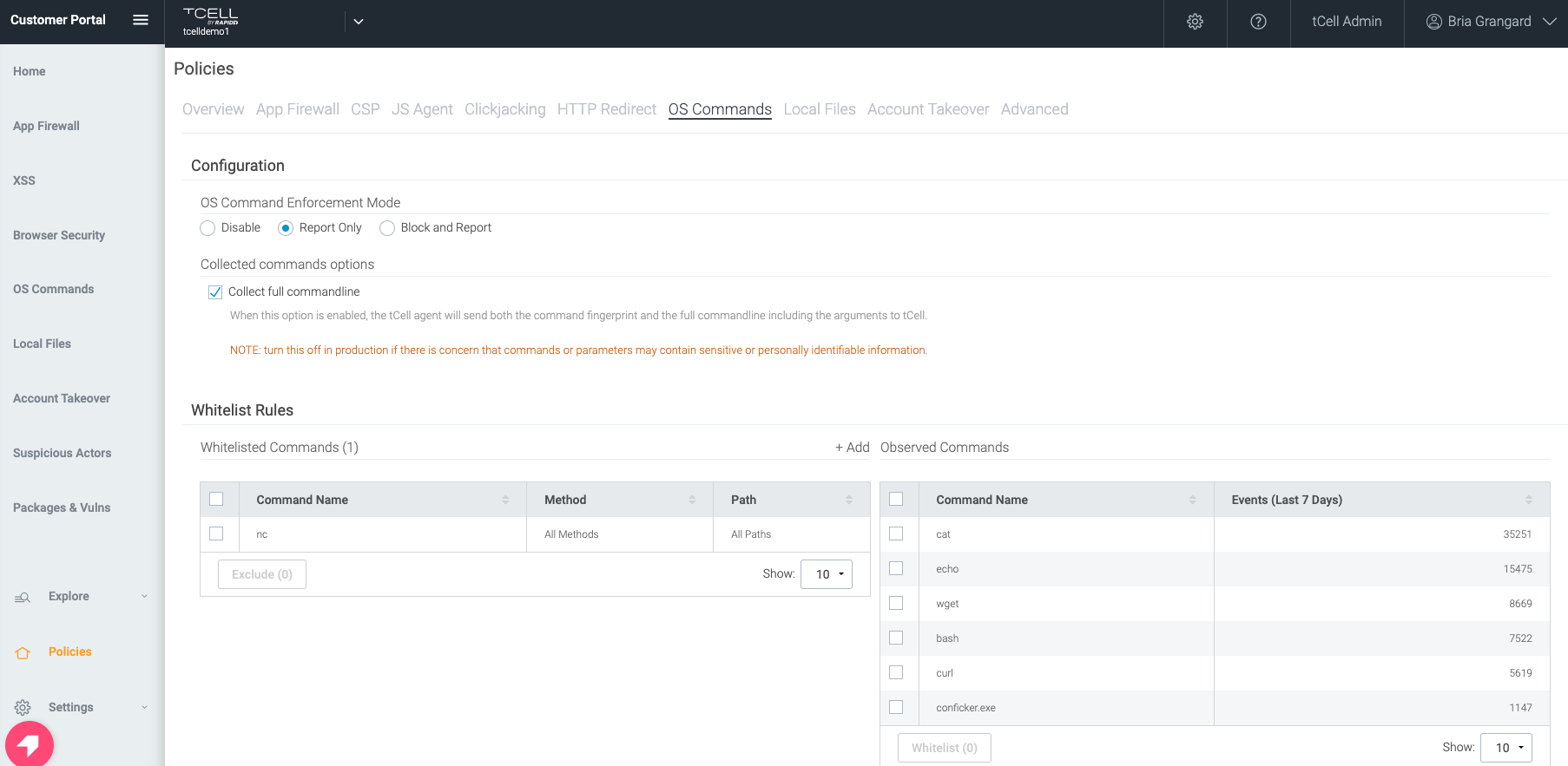 One of the benefits of using tCell’s app server agents is the fact that you can enable blocking for OS commands. This will prevent a wide range of exploits leveraging things like curl, wget, etc. Below you’ll find a picture of how to enable OS commands (either report only or block and report).