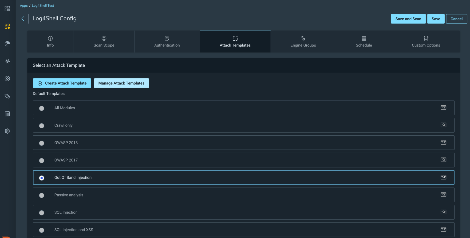 You can scan for this new Out of Band attack using either a new attack template we have created or by creating your own custom attack template and selecting this new attack module. We have added some highlights below, but you can find a detailed guide via our help docs.