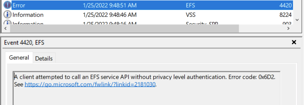 In December 2021, Microsoft released a patch for a different EFSRPC vulnerability: CVE-2021-43217. As part of the remediation for that issue, Microsoft implemented some hardening measures on EFSRPC communication. In particular, EFSRPC clients would need to use RPC_C_AUTHN_LEVEL_PKT_PRIVACY when using EFSRPC. If the client fails to do so, then the client is rejected and a Windows application event is generated.