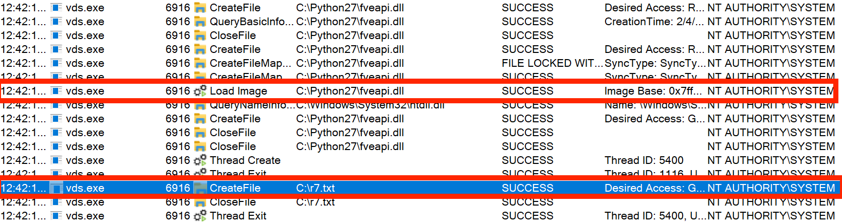 Below is the Procmon output demonstrating successful code execution as NT AUTHORITY\ SYSTEM when the “DFS Replication” service is restarted. Note that the malicious DLL is loaded and the file “C:\r7.txt” is created.