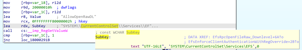 Microsoft first attempted to patch the EFSRPC forced authentication in August 2021 by blocking the use of EfsRpcOpenFileRaw over the lsarpc named pipe. To do this, they added logic to efslsaext.dll’s EfsRpcOpenFileRaw_Downllevel function to check for a value stored in the HKEY_LOCAL_MACHINE\SYSTEM\CurrentControlSet\Services\EFS\AllowOpenRawDL. Because this registry key doesn’t exist by default, a typical configuration will always fail this check.