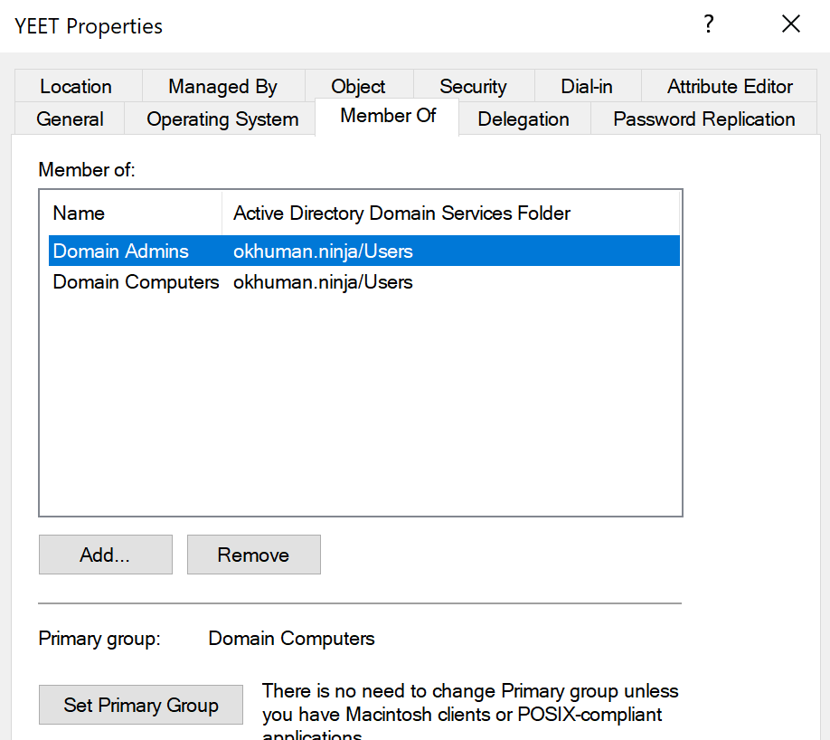 The only caveat for this example is that the victim’s machine account (aka computer account) is assigned to the Domain Admins group. Below, you can see the machine account for 10.0.0.12, YEET$, is a member of Domain Admins.