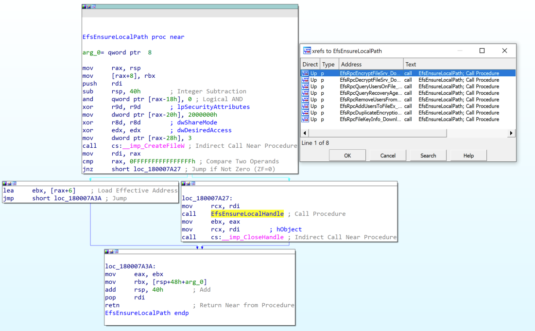 The December 2021 patch brought multiple changes to efslsaext.dll and resulted in partial mitigation of CVE-2021-43893. One of the changes was the introduction of two new functions: EfsEnsureLocalPath and EfsEnsureLocalHandle. EfsEnsureLocalPath grabs a HANDLE for the attacker provided file using CreateW. The HANDLE is then passed to EfsEnsureLocalHandle, which passes the HANDLE to NtQueryVolumeInformationFile to validate the characteristics flag doesn’t contain FILE_REMOTE_DEVICE.