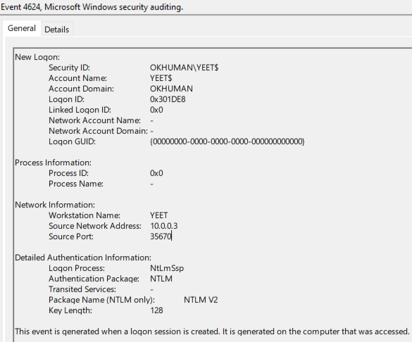 Once you have that, a low-privileged remote attacker can use EFSRPC to relay and escalate to other machines. However, the attack isn’t exactly silent. On 10.0.0.6, event ID 4624 was created when the 10.0.0.3 relay logged in using the YEET$ machine account.