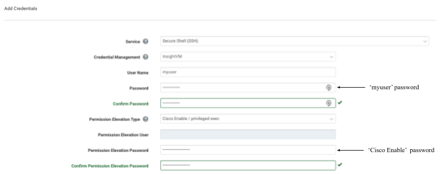 What this means in terms of configuring Cisco Enable / Privileged Exec elevation in the Security Console, is that the Permission Elevation Password on the “Add Credentials” page must be set to the Cisco Enable password configured on the devices.