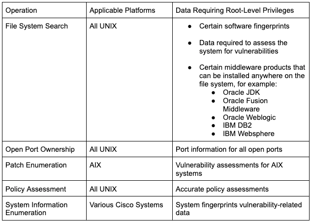 Elevation is critical to accurately assess an asset for vulnerabilities and system configurations. There are several key pieces of information that can only be collected with root-level privileges. Improperly configuring credential elevation is one of the most common causes of inaccurate or incomplete assessment results. The following table outlines a few key operations and pieces of data that require root-level privileges. It is important to note that this is a non-exhaustive list operations and data requiring root-level privileges – an exhaustive list would quickly become outdated as new data collection techniques are constantly being added to the product.