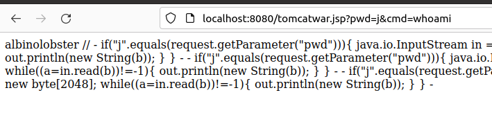 Attackers can then invoke commands. Here is an example of executing whoami to get albinolobster: