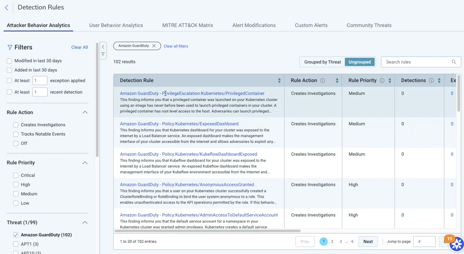We now have over 100 new AWS GuardDuty Attacker Behavior Analytics (ABA) detection rules to provide significantly more customization and tuning ability for customers compared to our previous singular third-party AWS GuardDuty UBA detection rule. With these new ABA alerts, it's possible to set rule actions, tune rule priorities, or add an exception on each individual GuardDuty detection rule.
