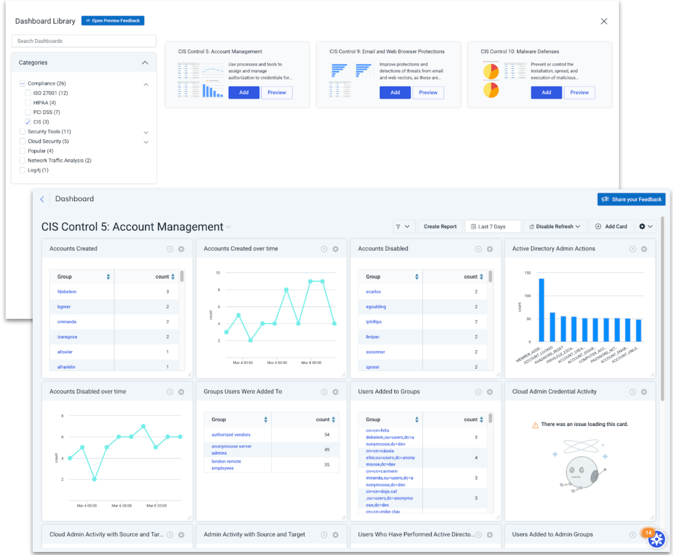 The CIS Critical Security Controls are a recommended set of actions for cyber defense that provide specific and actionable ways to thwart the most pervasive attacks. We know CIS is one of the most common security frameworks our customers consider, so we've recently added 3 new CIS control dashboards that cover CIS Control 5: Account Management, CIS Control 9: Email and Web Browser Protections, and CIS Control 10: Malware Defenses.