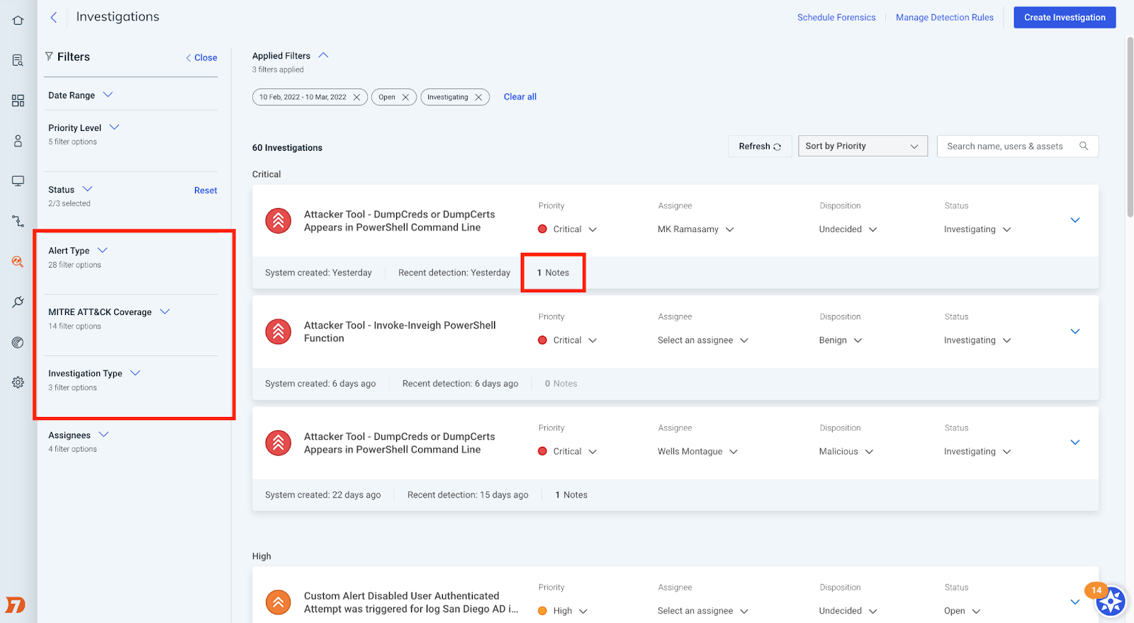 - New filters for alert type, MITRE ATT&CK tactic, and investigation type to provide more options when it comes to tailoring the list view of investigations