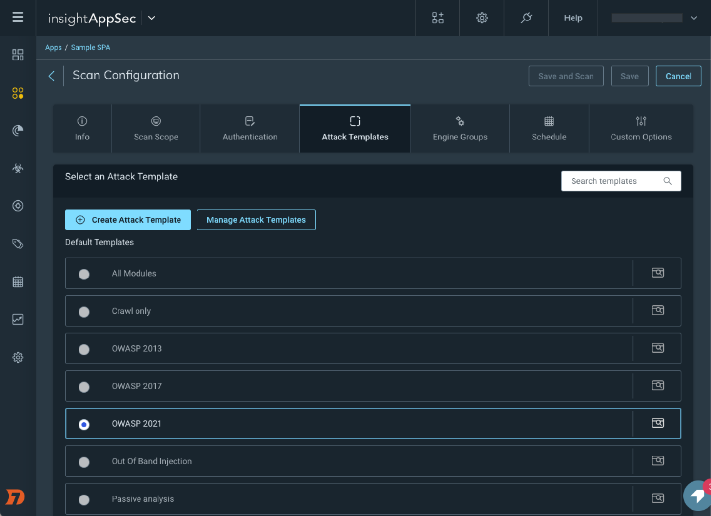Luckily, the OWASP organization has done the hard work for us. The new InsightAppSec OWASP 2021 attack template includes all the relevant attacks for the categories defined in the latest OWASP version.