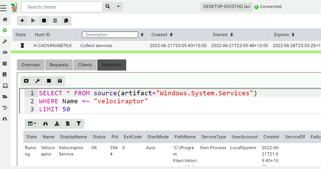 Velociraptor collections or hunts are usually post-processed or filtered in Notebooks. This allows users to refine and post-process the data in complex ways. For example, to view only the Velociraptor service from a hunt collecting all services (Windows.System.Services), one would click on the Notebook tab and modify the query by adding a WHERE statement.