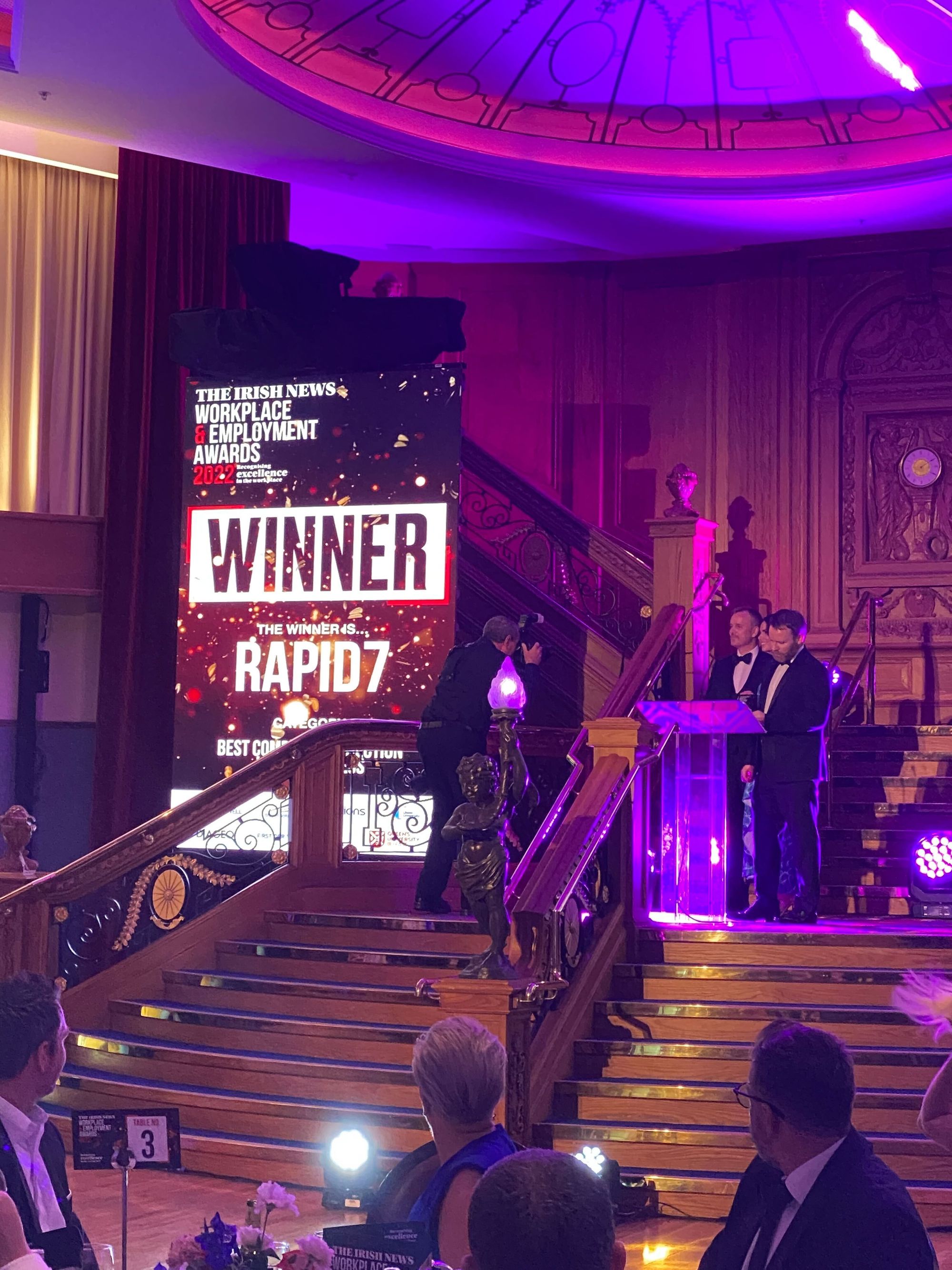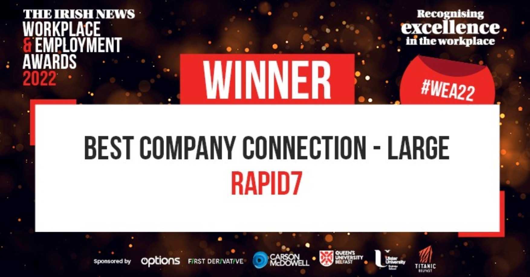Irish News has recognized Rapid7 in its Workplace and Employment Awards, where we’ve taken home the trophy for Best Company Connection. Reflecting on the past two years, this award recognizes the organization that best demonstrates how it has adapted its workplace well-being strategy to the challenges of remote working influenced by the COVID-19 pandemic. Specifically, this includes how the company has remained committed to providing excellent support to its staff throughout, and maintaining contact and connection with workers during periods of uncertainty and isolation.