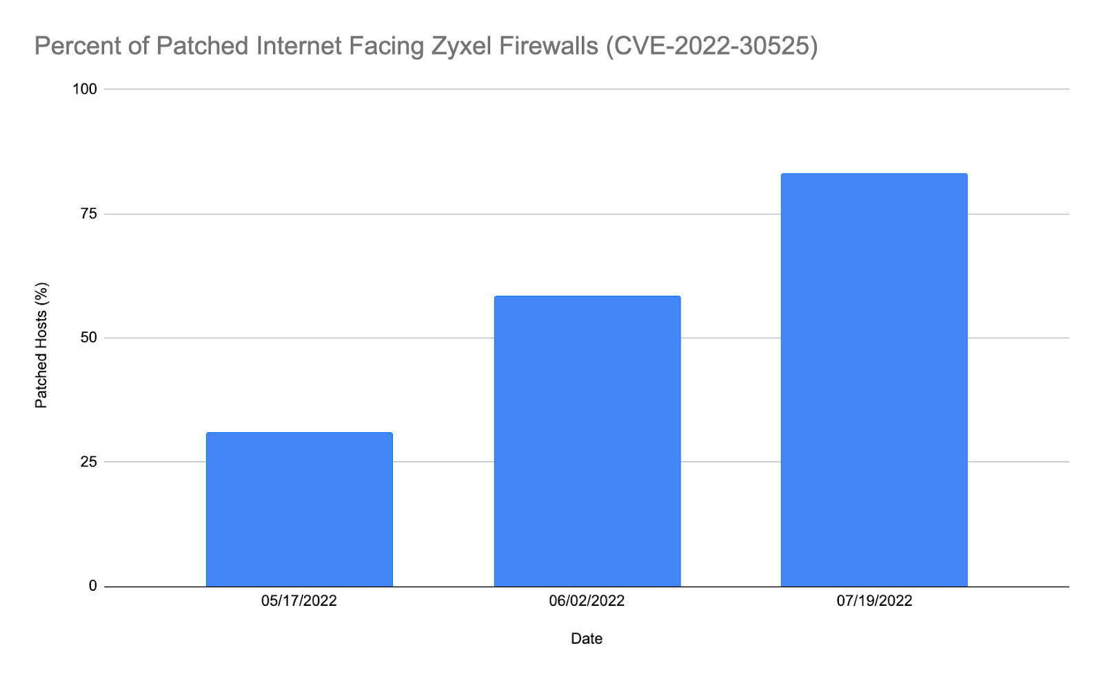 CVE-2022-30526 is only useful when used with another vulnerability, such as CVE-2022-30525. Rapid7 has been monitoring patch adoption on Shodan since CISA added the vulnerability to their Known Exploited Vulnerabilities Catalog. We are happy to note that patch adoption has continued to rise over time.