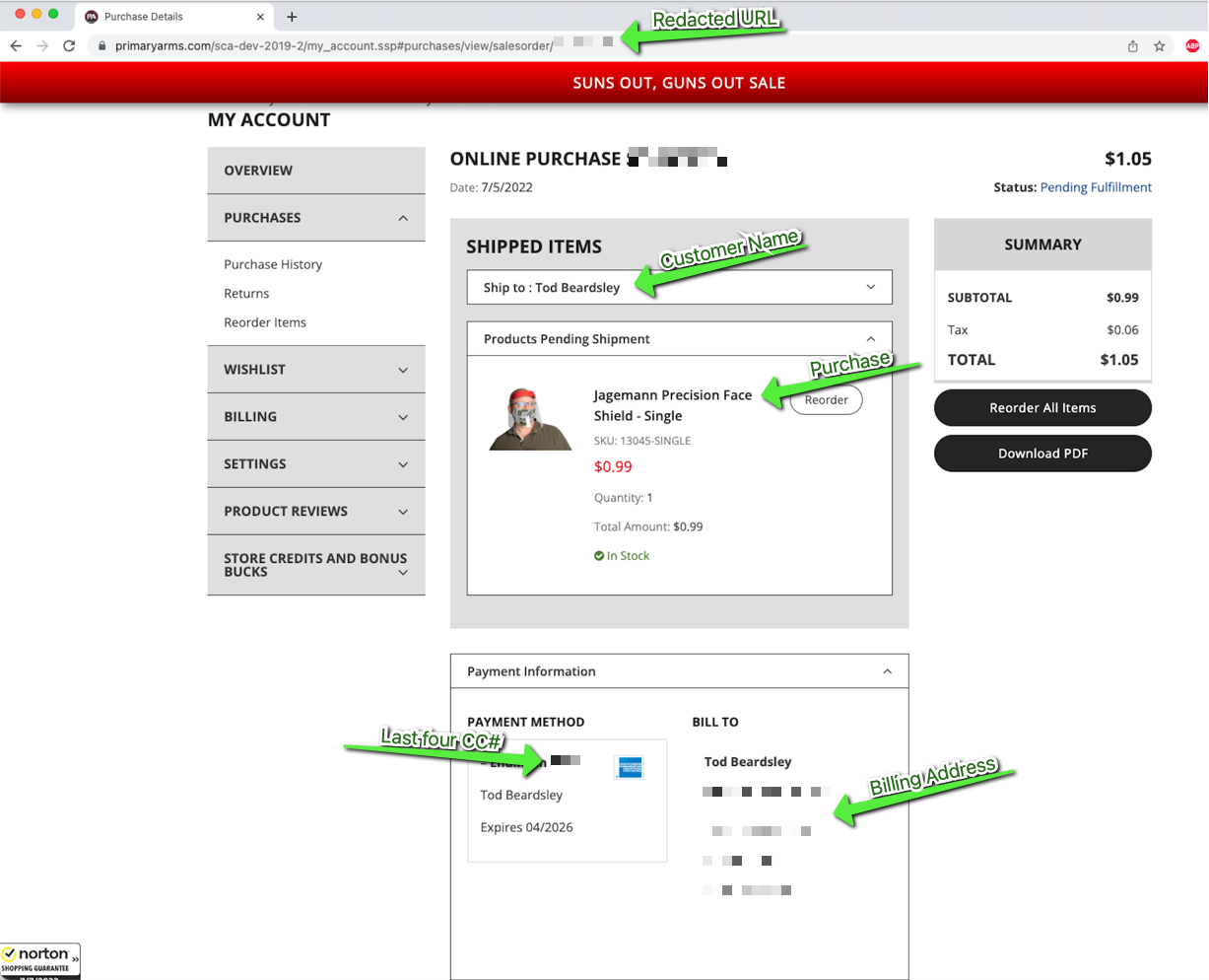 An authenticated user can inspect the purchase information of other Primary Arms customers by manually navigating to a known or guessed record sales order URL, as demonstrated in the series of screenshots below.