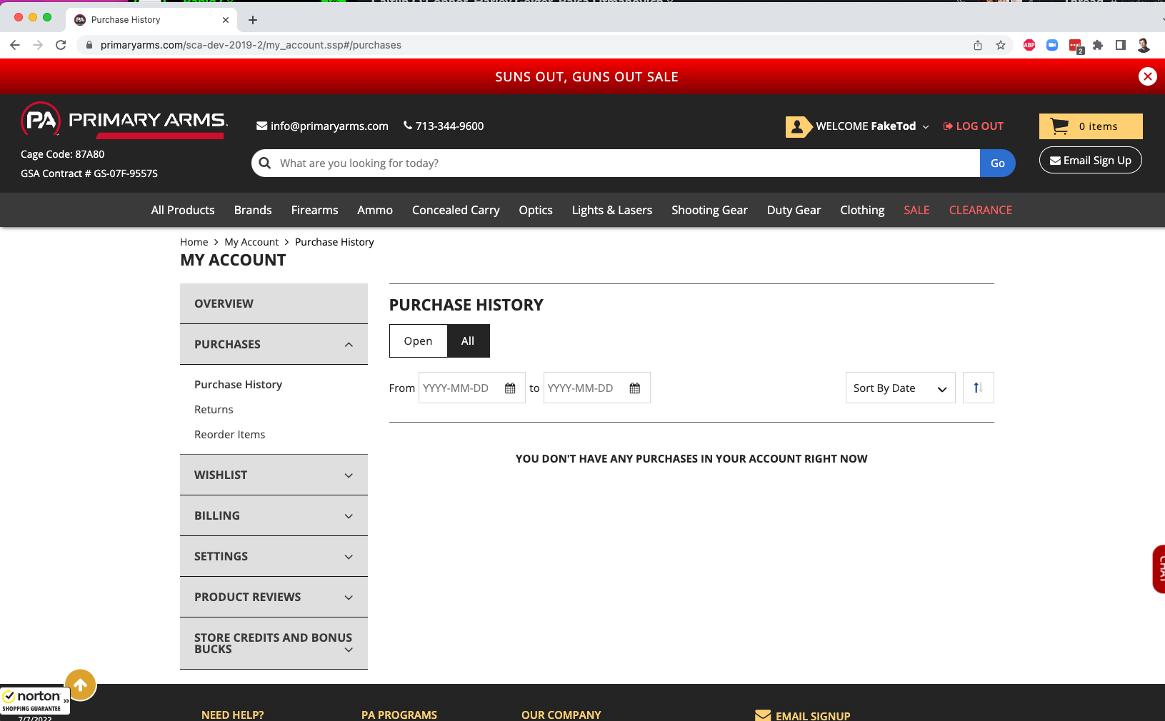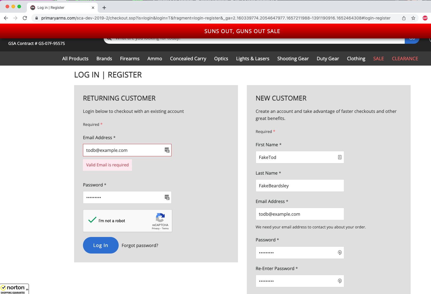Note that becoming an authenticated user is trivial for the Primary Arms website. New users are invited to create an account, and while a validly formatted email address is required, it is not authenticated. In the example gathered here, the simulated attacker, FakeTod, has the nonexistent email address of [email protected]. Therefore, there is no practical difference between an unauthenticated user and an authenticated user for the purpose of exploitation.