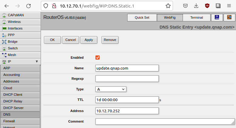 The video demonstrates exploitation of an unauthenticated and remote command injection vulnerability on a QNAP TS-230 running QTS 4.5.1.1480 (reportedly the last version affected by CVE-2020-2509). We were unable to obtain the first patched version, QTS 4.5.1.1495, but we were able to confirm this vulnerability was patched in QTS 4.5.1.1540. However, we don’t think this is CVE-2020-2509. The exploit in the video requires the attacker be a man-in-the-middle or have performed a DNS hijack of update.qnap.com. In the video, our lab network’s Mikrotik router has a malicious static DNS entry for update.qnap.com.