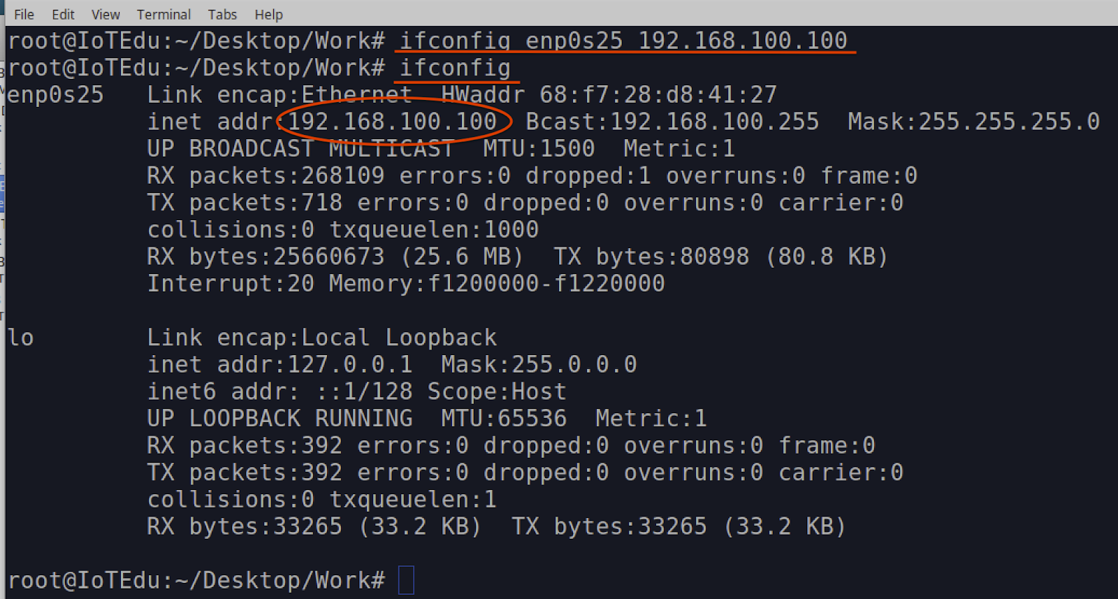 In our example, the ethernet interface is enp0s25, as shown above. Using that interface name (enp0s25), we can set the local IP address to 192.168.100.100 using the following command