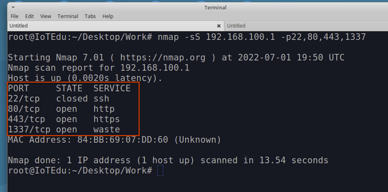 - nmap -sS 192.168.100.1 -p 22,80,443,1337