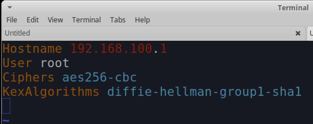 Once in vi, make the following entries in the config file shown below in Figure 14. These entries will enable support for access to cable modem at 192.168.100.1, for the user root, a Cipher of aes256-cbd, and the Diffie-hellman key exchange.