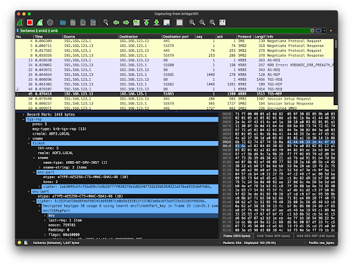 Once the new Keytab file is created, modify Wireshark to use the exported encryption keys in Edit -> Preferences -> Protocols -> KRB5, and select try to decrypt Kerberos blobs. Now Wireshark will automatically try to decrypt Kerberos blobs — the blue highlighted lines show Wireshark’s decryption working: