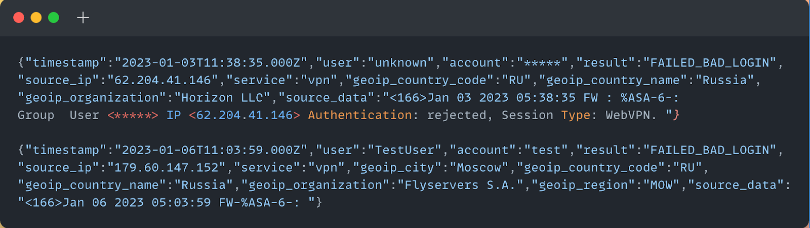 The below image is an anonymized log entry where an attacker attempts a (failed) login to the Cisco ASA SSL VPN service. In our analysis of log files across different incident response cases, we frequently observed failed login attempts occurring within milliseconds of one another, which points at automated attacks.