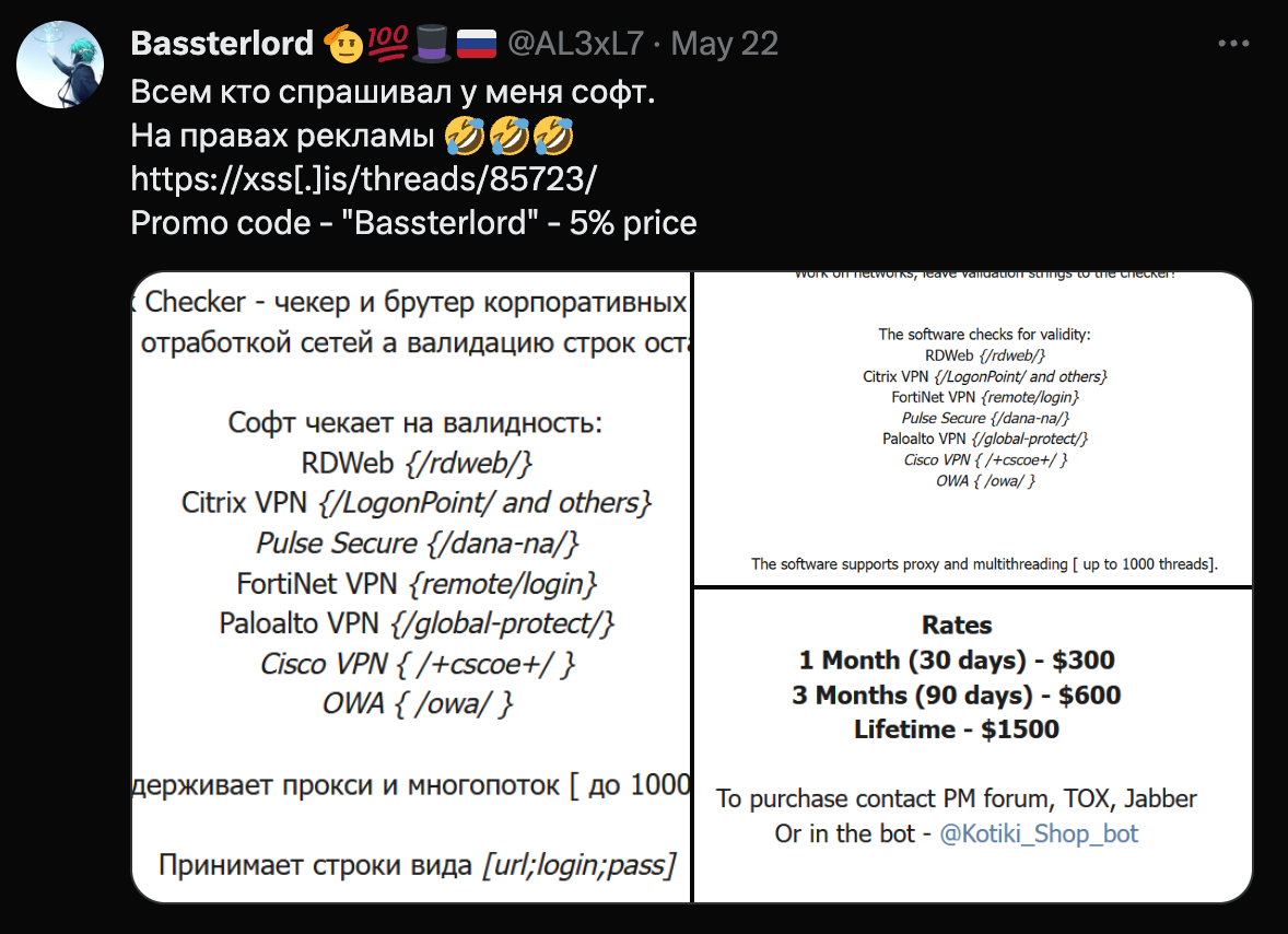 In parallel with incident response investigations into ASA-based intrusions, Rapid7 threat intelligence teams have been monitoring underground forums and Telegram channels for threat actor discussion about these types of attacks. In February 2023, a well-known initial access broker called “Bassterlord” was observed in XSS forums selling a guide on breaking into corporate networks. The guide, which included chapters on SSL VPN brute forcing, was being sold for $10,000 USD.