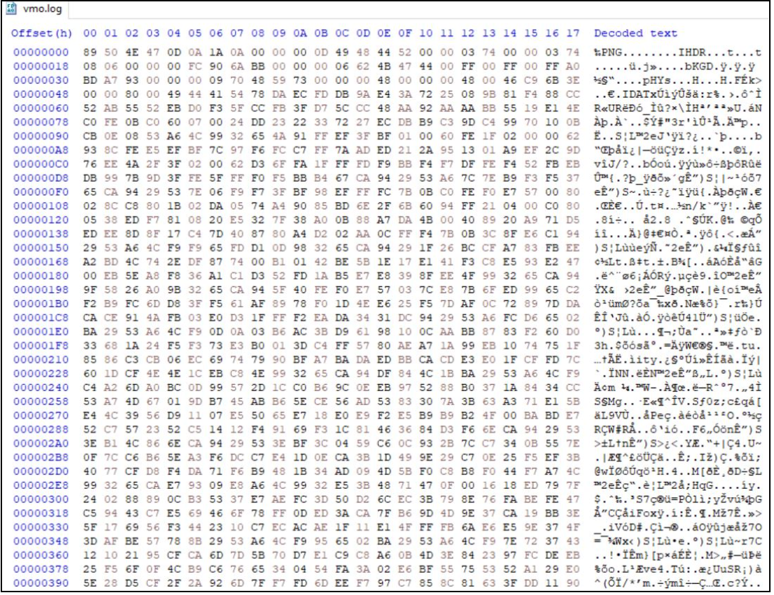 When executed, the MSI dropper will write a legitimate VMwareHostOpen.exe executable, multiple legitimate dependencies, and the malicious Dynamic-Link Library (DLL) file vmtools.dll. It will also drop an encrypted vmo.log file which has a PNG file structure and is later decrypted by the malicious DLL.