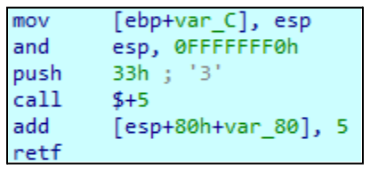 Heaven's Gate is widely used by threat actors to evade security tools. It refers to a method for executing a 64-bit process within a 32-bit process or vice versa, allowing a 32-bit process to run in a 64-bit process. This is accomplished by initiating a call or jump instruction through the use of a reserved selector. The key points in analyzing this technique in our case is to change the process mode from 32-bit to 64-bit, the specification of the selector “0x0033” required and followed by the execution of a far call or far jump, as shown in Figure 8.