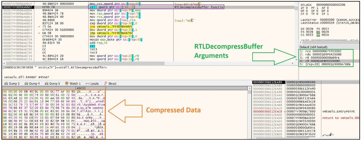 Once the DLL decrypts the data in memory, it is decompressed using the RTLDecompressBuffer function. The parameters passed to the function include:
