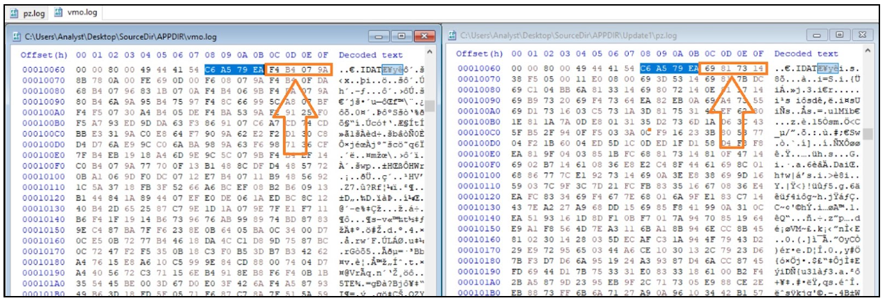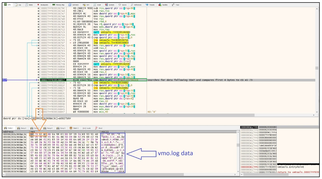 The DLL then reads the contents from vmo.log into memory and searches for the string …IDAT. The DLL takes 4 bytes following …IDAT and compares them to the hex values of C6 A5 79 EA. If the 4 bytes following …IDAT are equal to the hex values C6 A5 79 EA, the DLL proceeds to copy all the contents following …IDAT into memory.