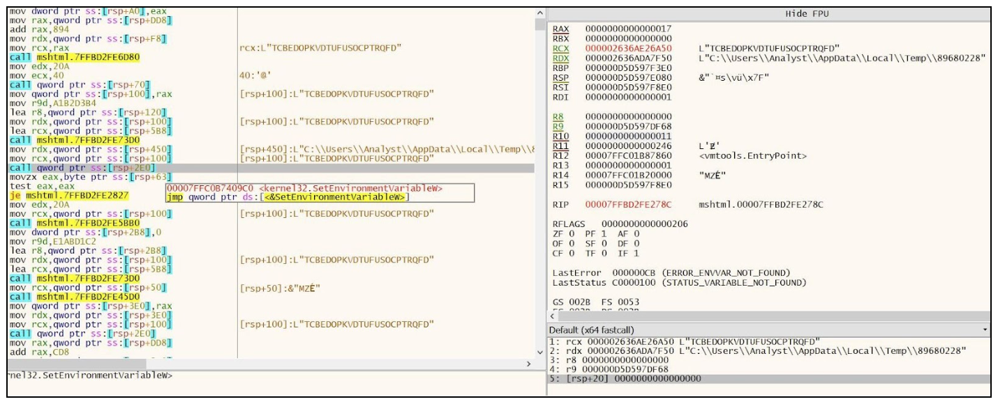 Next, the IDAT loader gets the computer name by calling GetComputerNameW API call, and the output is randomized by using rand and srand API calls. It uses that randomized value to set a new environment variable by using SetEnvironmentVariableW. This variable is set to a combination of %TEMP% path with the randomized string created previously.