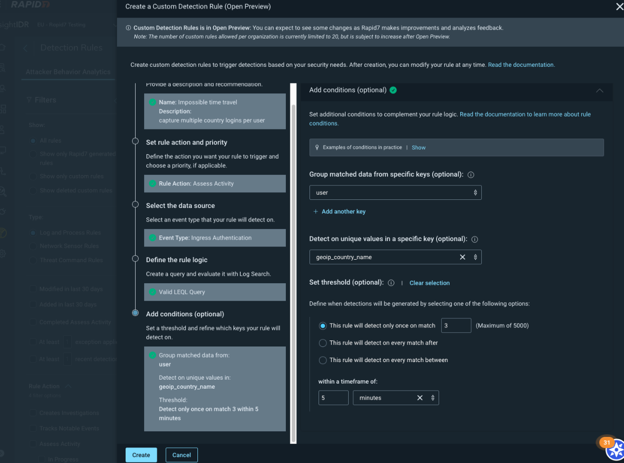 - Build upon Rapid7’s library of expertly curated detection rules by creating rules that uniquely fit your organization’s security needs