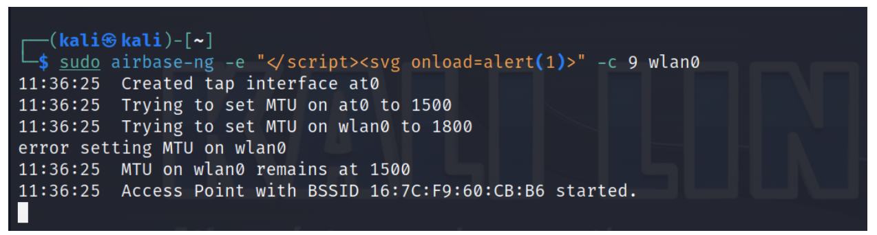 This XSS attack via SSID injection method can be done by running a software-based Wi-Fi access point to broadcast HTML or JavaScript as the SSID name such as: