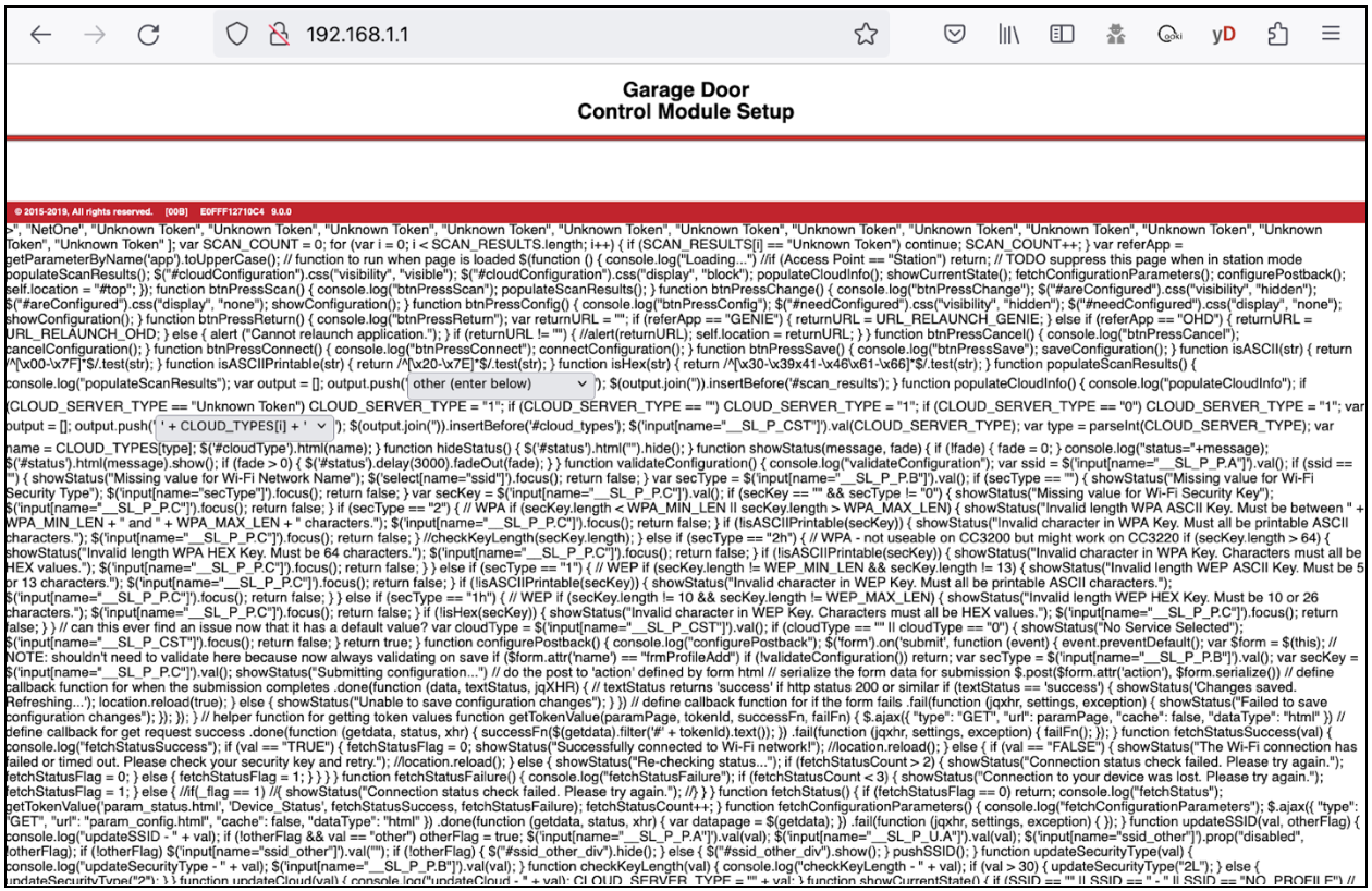 The device allows unauthenticated access to Garage Door Control Module Setup configuration page on TCP Port 80, This allows anyone with network access to reconfigure the Wi-Fi settings without being challenged to authenticate. A sample of this access to the configuration web page is shown in Figure 6: