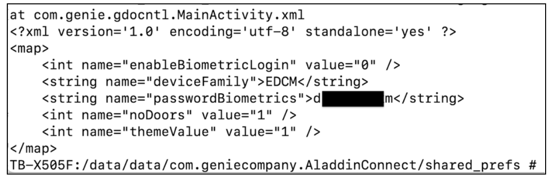 While examining the Android mobile application, Aladdin Connect, for general security issues, Rapid7 found that the user’s password was stored in clear text in the following file: