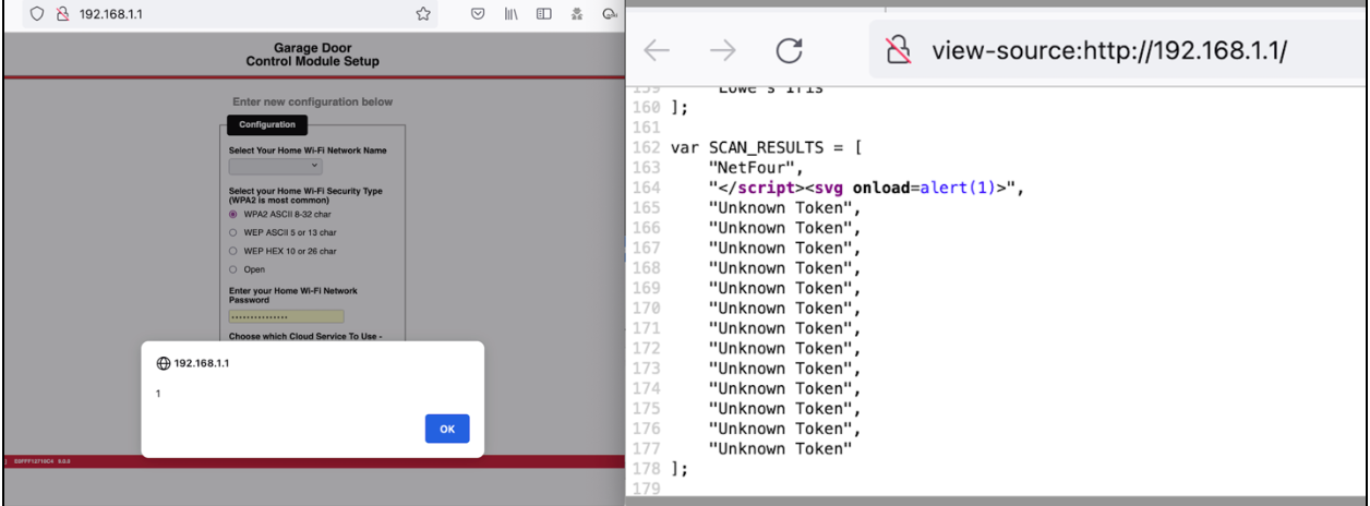 In the example found in Figure 4, a simple alert box is triggered on the Aladdin base unit Wi-Fi configuration webpage from the above SSID name. Also, the image on the right of Figure 4 shows the actual web page source delivered to the end user. No user interaction is needed to trigger this, they only need to view the web page during configuration mode.