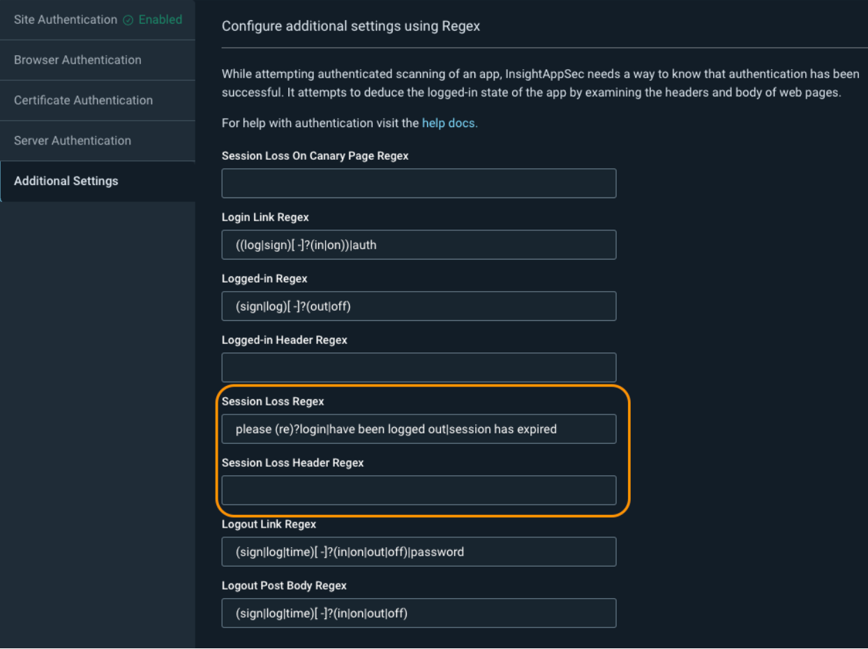 Next, we have Authentication -> Additional Settings. While you might not encounter this for all of your web applications, sometimes InsightAppSec will show that it was constantly detecting logouts in the scan logs. When this happens, the scan will attempt to log back in again, and if it keeps detecting these false session losses over and over, it can cause the scan to take a very long time to complete.