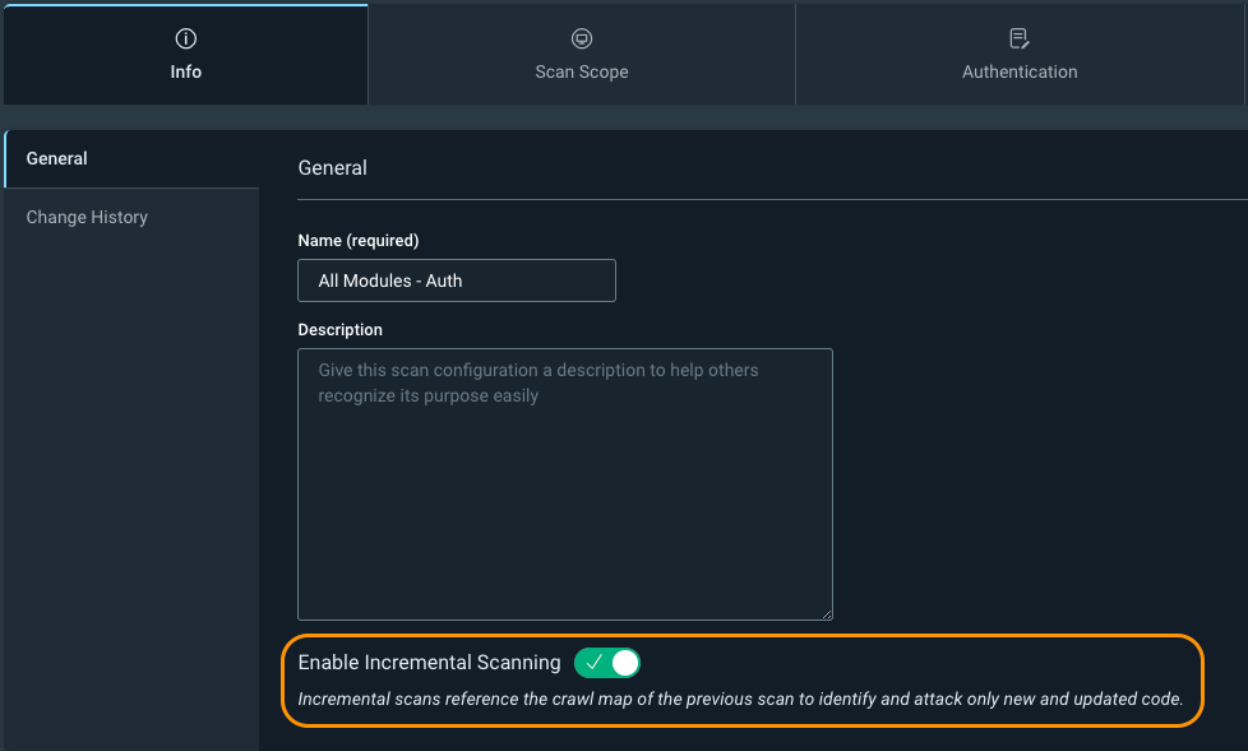 The first setting is Info -> Enable Incremental Scanning. Incremental scanning will take the crawl map of the previous scan and only hit new or updated web pages. It uses the crawl signature of a page, and if it doesn’t exist in the previous scan, or is different, then the scanner will attack it. This is especially useful if you have InsightAppsec as part of your CI/CD pipeline process, and you don't need to run a full scan every time a new build gets created. Just be aware that you will see fewer vulnerabilities on your web app because we are scanning fewer pages. It is still recommended you run periodic full scans of your web app without incremental scanning enabled to ensure maximum visibility into the vulnerability findings.