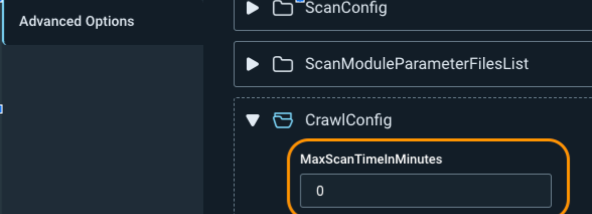 If you need to set a maximum amount of time for the scan to run, you can adjust the MaxScanTimeInMinutes under CrawlConfig. This stops the scan at a certain time, whether the scan is complete or not. This can cause your scan to miss directories and to not get a complete picture of your web application vulnerabilities, so only use it if absolutely necessary.