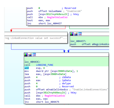 After completing its service termination routine, the malware tries to access the registry key SOFTWARE\Microsoft\Windows\CurrentVersion\Policies\System, known for storing system policies such as User Account Control (UAC) settings. If successful, it modifies two registry values: `EnableLUA` and `EnableLinkedConnections`.
